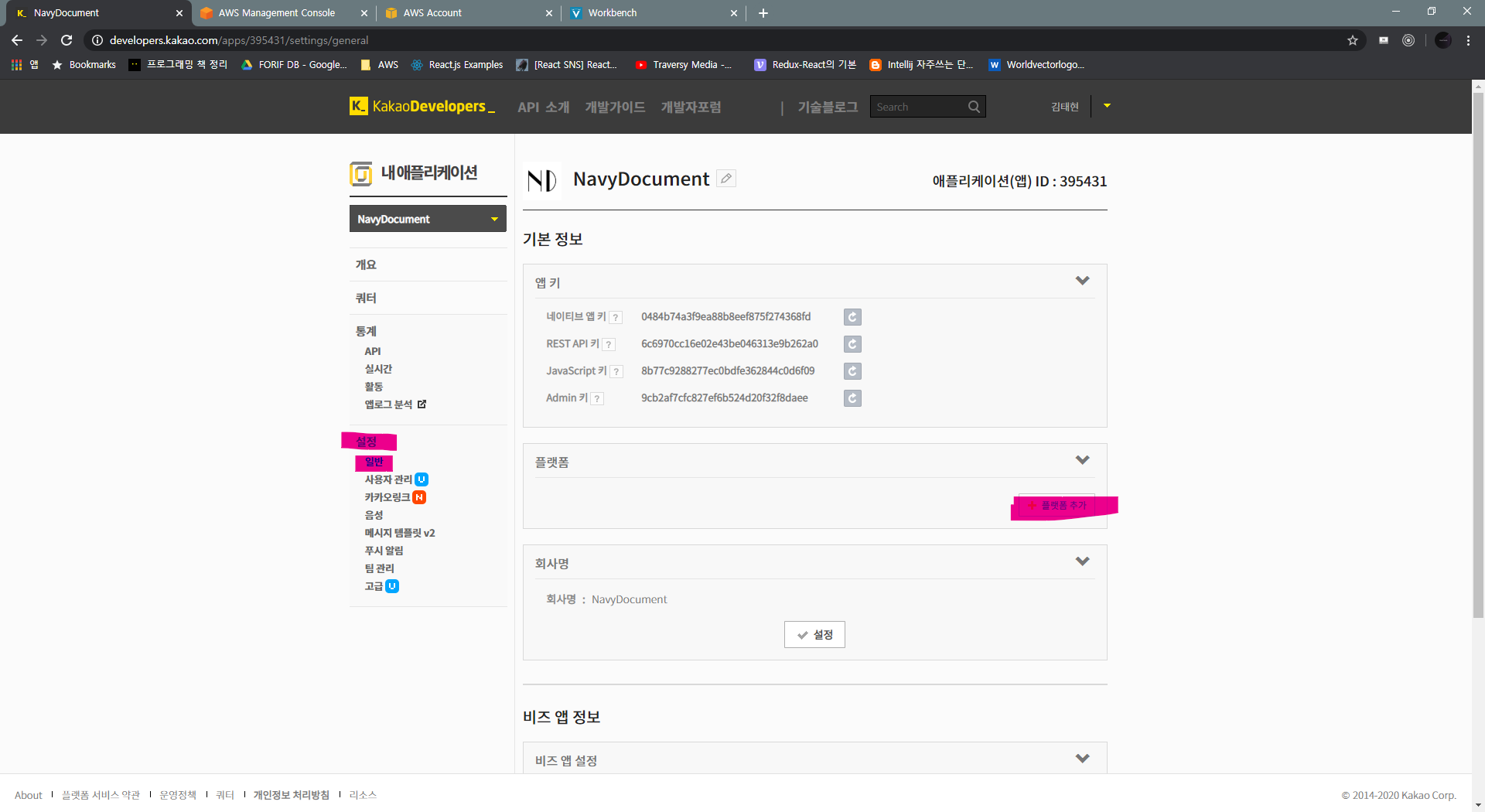 설정-일반-플랫폼 추가 순으로 클릭해줍니다.