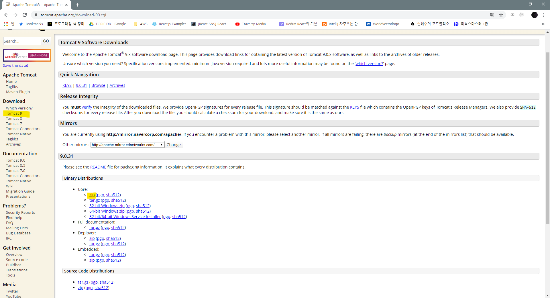 좌측 Download 탭에 원하는 Tomcat 버전을 클릭하면, 압축파일을 다운로드 할 수 있습니다.