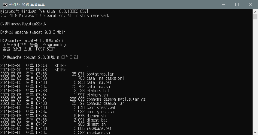 이 파일을 원하는 위치에 압축해제 해줍니다. 저 같은 경우는 D:\apache-tomcat-9.0.31 에 cmd로 찾아가기 쉽도록 압축을 풀어놓았습니다.