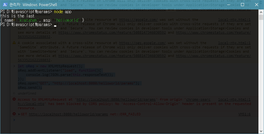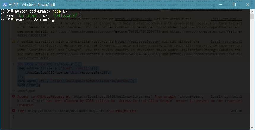 이 코드를 작성하고 저장하여 다시 node app 으로 실행해보자. 그러면