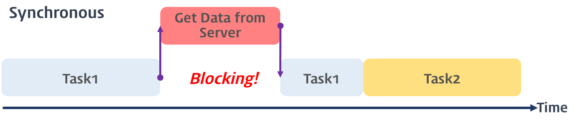위 도표와 같이 Task1의 과정 중간에 Get Data from Server 작업이 발생할때, 이 작업이 이루어지는 동안 Task1, Task2가 중지되어 있는 상태를 유지하고 Get Data from Server 작업이 마무리 되면 다시 Task1, Task2 과정이 재개 되는 방식이 바로 '동기식 처리 방식'이다.