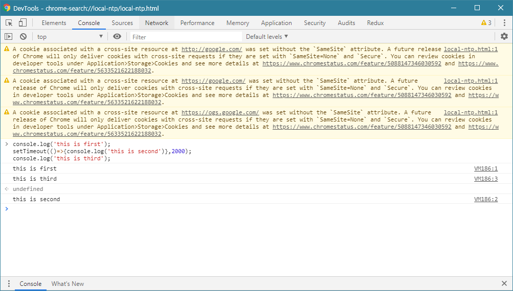 이렇게 this is first와 this is third가 출력되고 그 다음 2초 후에 this is second가 출력되는 것을 확인할 수 있다. setTimeout은 첫 번째 매개변수로 받은 함수를 두 번째 매개변수 의 시간이 지나면 실행시키는, 대표적인 비동기 처리방식의 함수이다. setTimeout으로 2초를 지연시켰음에도, 다른 작업(this is first출력, this is third출력)이 먼저 실행445되고 2초후 this is second가 출력이되며 비동기적으로 작동한다는 것을 알 수 있다.