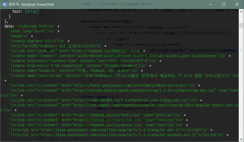 이 html 에서 직접 문자열을 검색해서 '목차'에 해당하는 부분을 찾을 수도 있겠지만, 복잡하고 어려운 작업이다. 이를 훨씬 쉽게 해결해주는 모듈이 있는데, 바로 cheerio 이다.