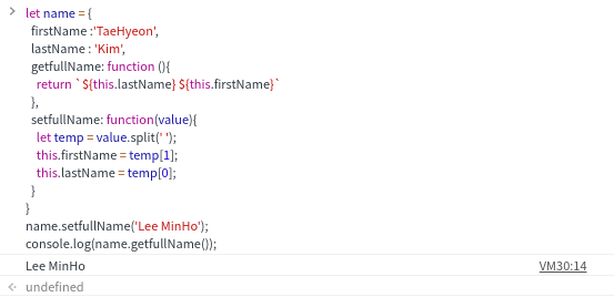 name 객체에 getfullName과 setfullName 메서드를 추가하였다. 이제 getfullName 은 이름 문자열을 반환하고, setfullName은 이름 문자열을 설정한다.