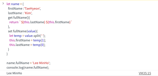 fullName 이라는 프로퍼티 키 하나로, getter 과 setter의 기능 모두를 사용할 수 있다. '접근자 프로퍼티'의 활용이 바로 이러한 방식이다.