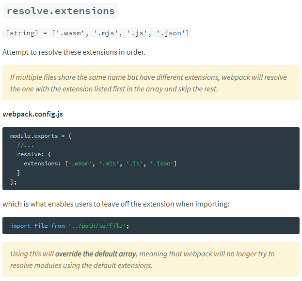 webpack docs 에서 resolve.extensions 부분을 읽어보면 아래와 같이 설명 되어 있다.