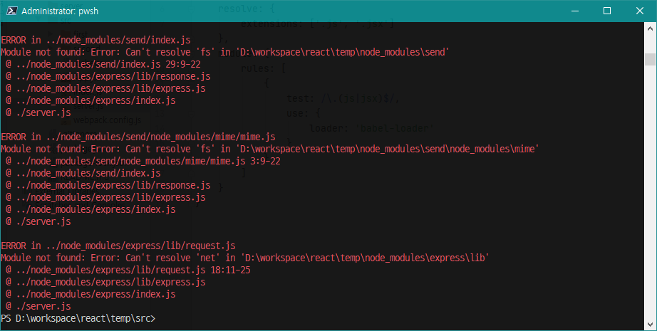 'fs'와 'net' 모듈을 resolve 할 수 없다는 에러이다. 사실 이러한 오류는 구글링을 조금만 해보면 바로 나온다. 해결책은 다음과 같다.