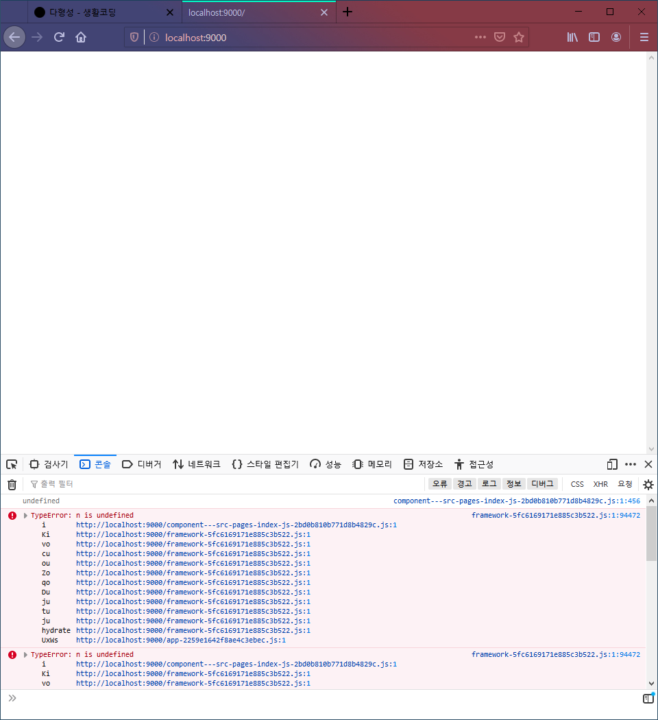 말도 안나오는 오류이다. gatsby new 로 새 프로젝트를 생성하고 파일들만 옮겨서 똑같이해봐도 똑같은 오류가 발생한다. 크롬에서도 같은 오류가 발생했다.