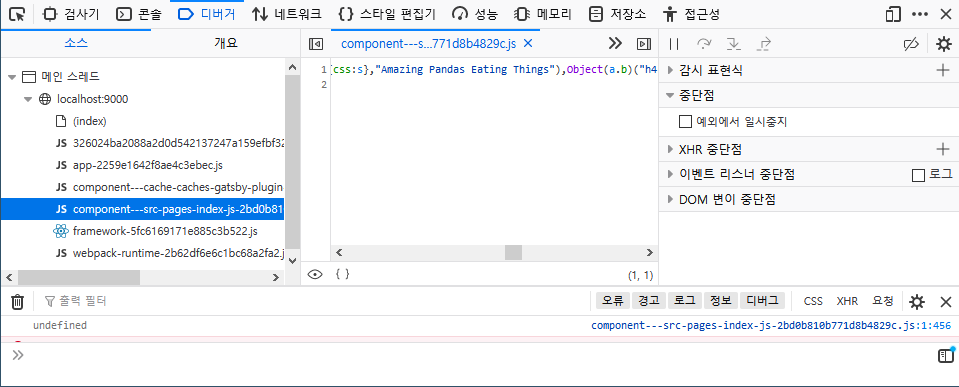 오류가 발생하는 파일에서는 "Amazing Pandas Eating Things" 라는 문자열이 적혀있다. 이 문자열은 내가 이전에 gatsby 홈페이지의 tutorial을 따라할 때 작성했던 페이지다. 그렇다. 파일명 뒤에 있는 hash에 문제가 있어보인다. 브라우저에서 내가 예전에 만들었던 파일을 캐싱하는데, 뒤에 해쉬가 문제가 있어서 잘못된 파일을 로드하는 것이다. 그래서 캐시를 사용하지 않는 Private 모드에서 실행해 보았다.