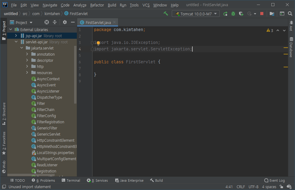 추가한 jar파일을 눌러보면 디렉터리가 jakarta.servlet 이런 이름으로 되어있다. 따라서 임포트 할때는