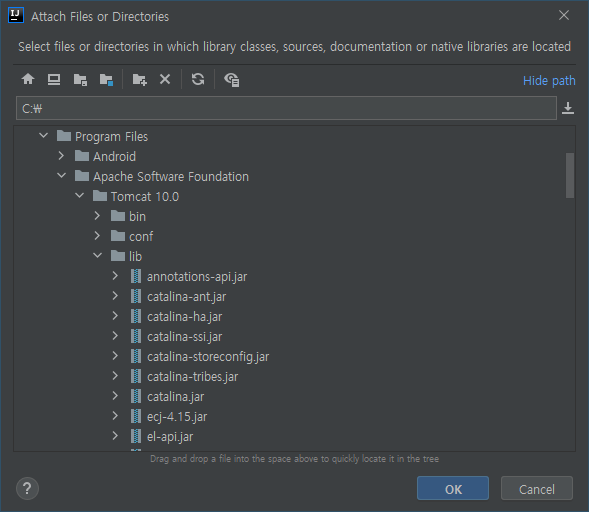 여기서 톰캣을 설치한 폴더에가서 필요한 jar파일을 추가하면 된다.